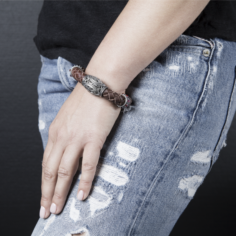 Стильный серебряный браслет на коже ручного плетения.