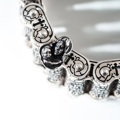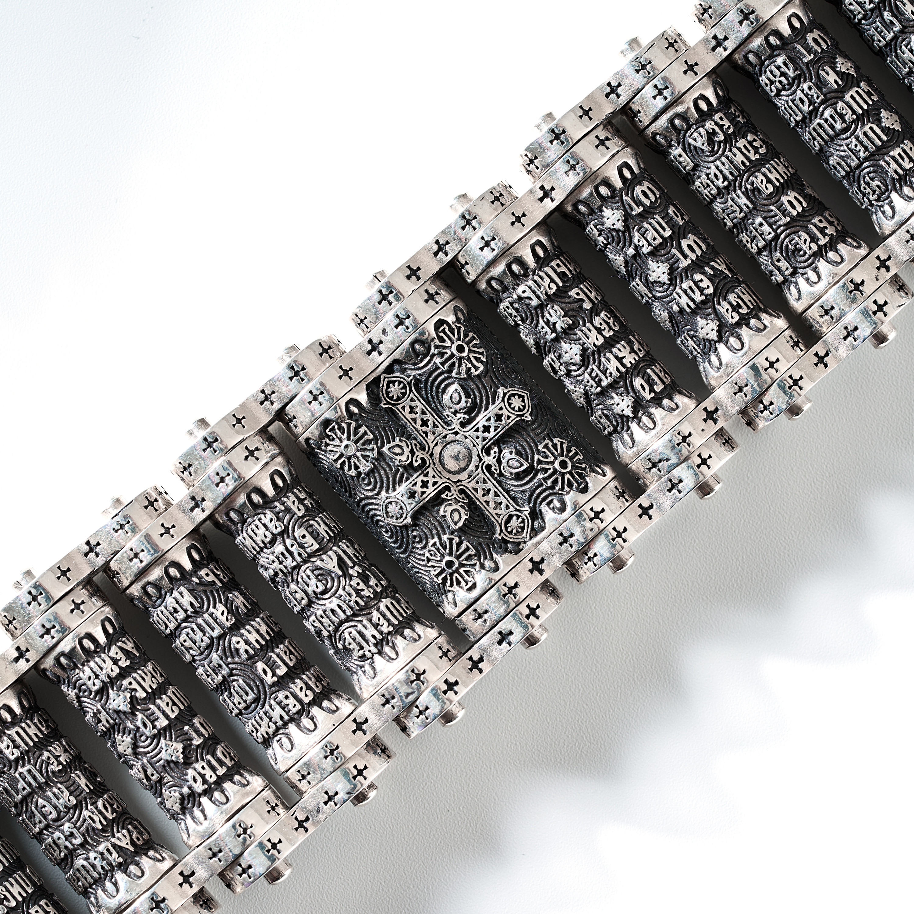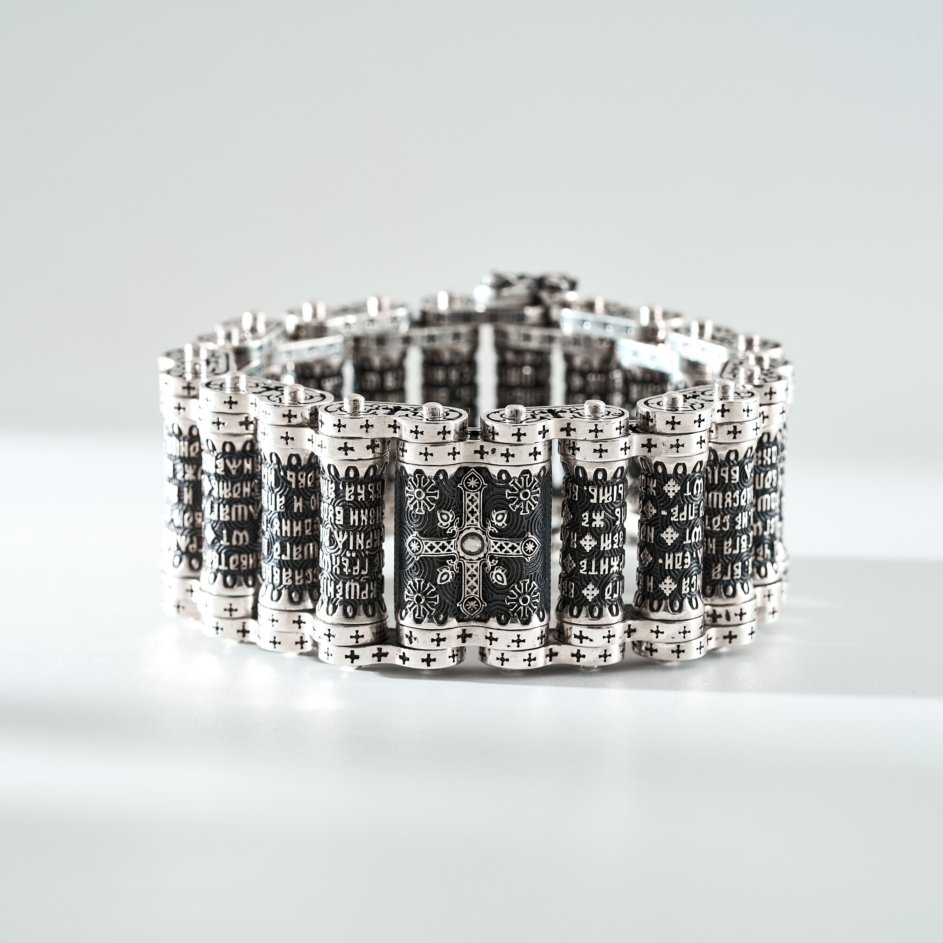 Центральные звенья (цилиндры)  браслета обрамляет полный текст молитвы «СИМВОЛ ВЕРЫ» на церковнославянском языке.